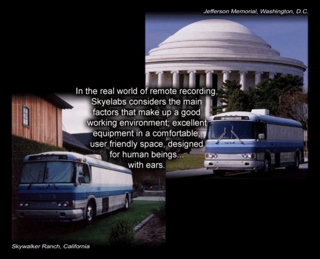"Rover", Skyelabs' mobile recording unit, offers the finest in mobile acoustic environments and equipment for live concert recording, remote broadcast, audio for picture, and in-house recording. From Live-to-Two-Track to multiple 3348's. From ISDN Live Broadcast to ADAT, Skyelabs delivers clean, accurate recordings and broadcasts. Our credits range from AC/DC to the San Francisco Opera, U2 to Herbie Hancock, and Van Morrison to Chick Corea. Rover features full 5.1 surround sound mixing capabilities. For more than just saturated tracks, or, if you prefer recording and mixing at your place, give us a call.